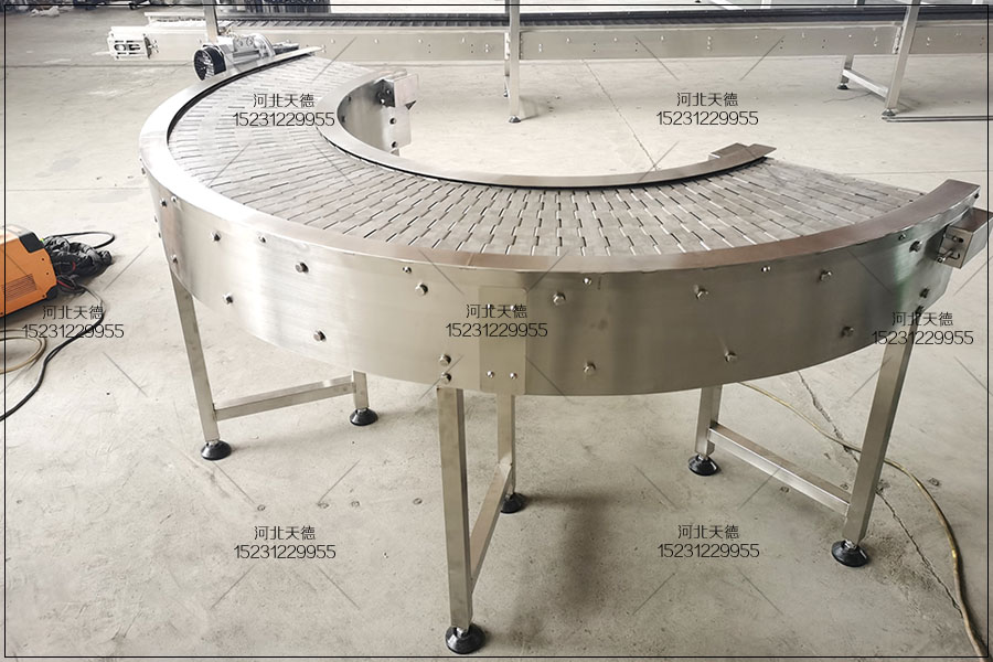 2、鏈條轉(zhuǎn)彎機故障預(yù)防措施及日常維護 傳送鏈條的組裝:鏈條轉(zhuǎn)彎機嚴格按出廠時的配對鏈條進行組裝,鏈條長度按照安裝要求生產(chǎn),鏈條不得有扭曲現(xiàn)象;鏈板輸送帶、接鏈環(huán)、連接鏈的安裝位置與方向應(yīng)符合安裝的要求;接鏈環(huán)焊縫 應(yīng)向上,以減少鏈條轉(zhuǎn)彎機環(huán)焊縫的磨損及焊縫對槽底板的磨損,以延長鏈條接鏈環(huán)的使用時間;接鏈環(huán)須按安裝要求正確連接,螺栓或銷子須安裝到位;安裝輸送機的過程中嚴禁頻繁點動,預(yù)防零部件損壞。